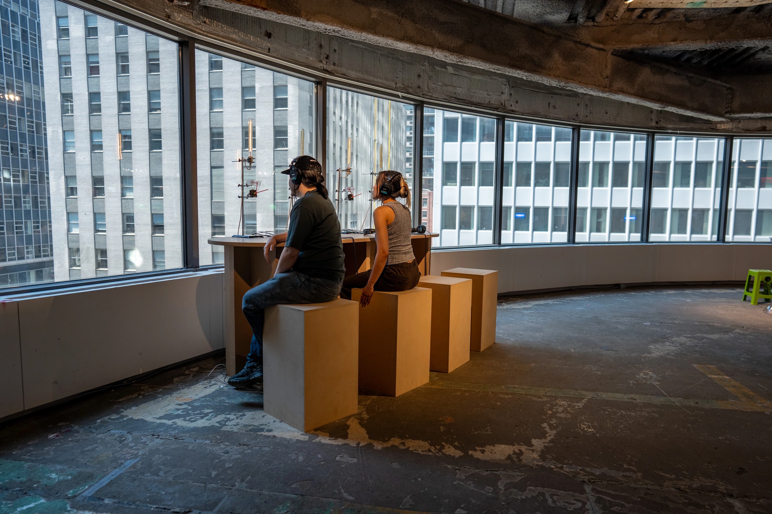 ATC Soundscapes is a participatory installation that merges live air traffic control (ATC) radio feeds with a procedurally generated synthesizer soundscape. The work is an invitation to explore deep listening for up to four participants at a time, who operate a toggle to switch between two simultaneous feeds. Listeners partake in the collective creation of a meditative and somatic composition, leveraging the efforts of communities who receive local air traffic control frequencies and rebroadcast them onto internet radio via liveatc.com. The global network of audio transmissions becomes a generative sonic landscape, bending and transforming various signals with resonant filter sweeps and binaural audio effects.